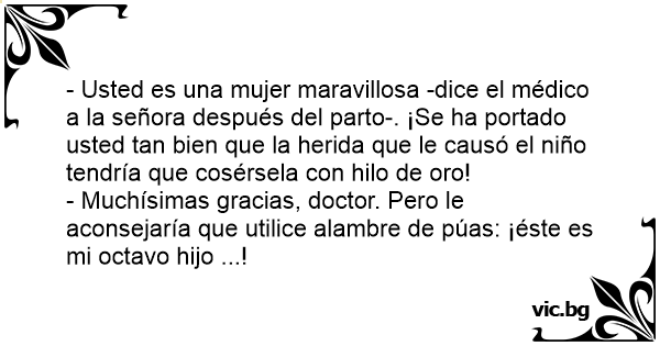 - Usted es una mujer maravillosa -dice el médico a la señora después del parto-. ¡Se ha portado usted tan bien que la herida que le causó el niño tendría que cosérsela соn hilo de oro!