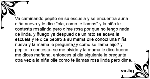 Va caminando pepito en su escuela y se encuentra auna niña nueva y le dice "ola, como te llamas" y la niña le contesta rosalinda pero dime rosa por que no tengo nada de linda, y ñuego ya despued de un rato se acava la escuela y le dice pepiro a su mama olle conoci una niña nueva y la mama le pregunta¿y como se llama hijo? y pepito lo contesta- se me olvido y la mama le dice bueno me dices mañana, entonces al dia siguiente le pregunta otra vez a la niña olle como te llamas rosa linda pero dime rosa porque no tengo nada de linda, y luego ya llega pepito a su casa y la mama le pregunta que como se llama la niña y pues pepito le dice que se le olvido entonces la mama le dice que si no le dice como se llama añana le va a mochar el pito, y va pepito y le pregunta a la niña como te llamas y le responde rosalinda pero dime rosa por que no tengo nada de linda, ya despues de un rato llega pepito a su ncasa y lregunta como se llamava la niña pepito y le dice que se le olvido y zaz que le mocha el pito y al dia siguiente llega a la escuela y le pregunta a la niña como te llamas y la niñe le dice que rosaa linda pero que lediga rosa por que no tiene nada de linda y le pregunta la ninña y como te llamas tu y pepito le responde pepito pero dime pepe por que no tengo nada de pito.