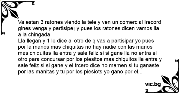 Va estan 3 ratones viendo la tele y ven un comercial !record gines venga y partisipe¡ y pues los ratones dicen vamos lla a la chingada