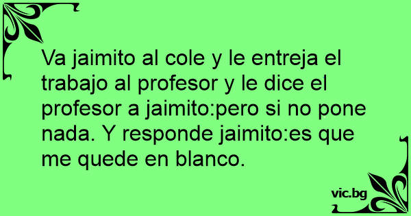 Va jaimito al cole y le entreja el trabajo al profesor y le dice el profesor a jaimito:pero si no pone nada. Y responde jaimito:es que me quede en blanco.