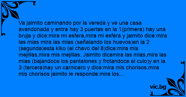Va jaimito caminando por la vereda y ve una casa avandonada y entra hay 3 puertas en la 1(primera) hay una bruja y dice:mira mi esfera,mira mi esfera y jaimito dice:mira las mias mira las mias (señalando los huеvоs)en la 2 (segunda)esta kiko (el chavo del 8)dice:mira mis mejillas,mira mis mejillas. Jaimito dicemira las mias,mira las mias (bajandoce los pantalones y frotandoce el сulо)y en la 3 (tercera)hay un carnicero y dice:mira mis chorisos,mira mis chorisos jaimito le responde:mira los mios,mira los mios (agarrandoce el pito)