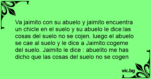 Va jaimito соn su abuelo y jaimito encuentra un chicle en el suelo y su abuelo le dice:las cosas del suelo no se cojen. luego el abuelo se cae al suelo y le dice a Jaimito:cogeme del suelo. Jaimito le dice : abuelito me has dicho que las cosas del suelo no se cogen