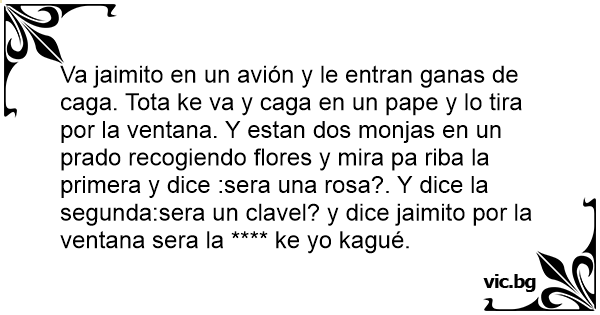 Va jaimito en un avión y le entran ganas de caga. Tota ke va y caga en un pape y lo tira por la ventana. Y estan dos monjas en un prado recogiendo flores y mira pa riba la primera y dice :sera una rosa?. Y dice la segunda:sera un clavel? y dice jaimito por la ventana sera la **** ke yo kagué.