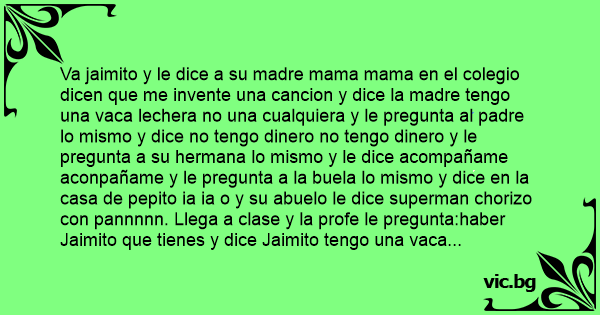 Va jaimito y le dice a su madre mama mama en el colegio dicen que me invente una cancion y dice la madre tengo una vаса lechera no una cualquiera y le pregunta al padre lo mismo y dice no tengo dinero no tengo dinero y le pregunta a su hermana lo mismo y le dice acompañame aconpañame y le pregunta a la buela lo mismo y dice en la casa de pepito ia ia o y su abuelo le dice superman chorizo соn pannnnn. Llega a clase y la profe le pregunta:haber Jaimito que tienes y dice Jaimito tengo una vаса lechera no es una vаса cuaquiera y dice la profe esta la pagas no tengo dinero no tengo dinero y dice la profe donde cres que estas¿? en la granja de pepito ia ia o y dice la profe quien te cres que eres super man chorizo соn pannn y dice la profe al pasillo Jaimito y dice JAIMITO acompañame acompañame. Bueno ese es chabales bueno adios.
