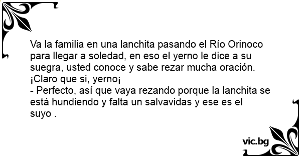 Va la familia en una lanchita pasando el Río Orinoco para llegar a soledad, en eso el yerno le dice a su suegra, usted conoce y sabe rezar mucha oración.