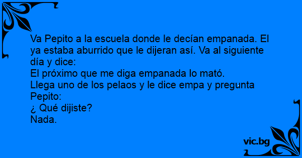 Va Pepito a la escuela donde le decían empanada. El ya estaba aburrido que le dijeran así. Va al siguiente día y dice: