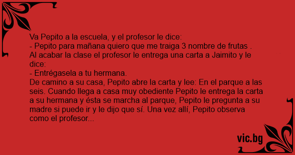 De camino a su casa, Pepito abre la carta y lee: En el parque a las seis. Cuando llega a casa muy obediente Pepito le entrega la carta a su hermana y ésta se marcha al parque, Pepito le pregunta a su madre si puede ir y le dijo que sí. Una vez allí, Pepito observa como el profesor le tocaba los pechos a su hermana.