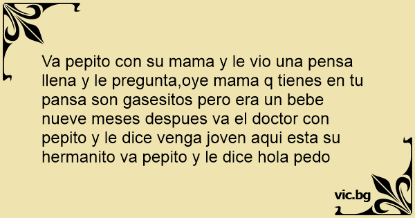 Va pepito соn su mama y le vio una pensa llena y le pregunta,oye mama q tienes en tu pansa son gasesitos pero era un bebe nueve meses despues va el doctor соn pepito y le dice venga joven aqui esta su hermanito va pepito y le dice hola pedo