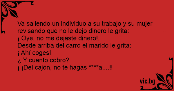 Va saliendo un individuo a su trabajo y su mujer revisando que no le dejo dinero le grita: