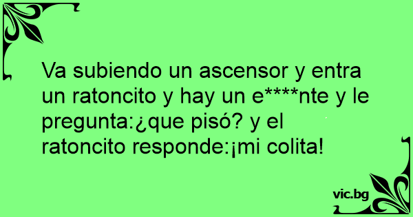Va subiendo un ascensor y entra un ratoncito y hay un e****nte y le pregunta:¿que pisó? y el ratoncito responde:¡mi colita!