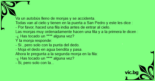 Un grupo de monjitas ha pasando por delante de San Pedro para entrar al cielo. Entonces, San Pedro le pregunta a la primera: - “Hermana Verónica, ¿ha tocado usted un miembro masculino alguna vez?”...