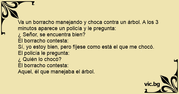Va un borracho manejando y choca contra un árbol. A los 3 minutos aparece un policía y le pregunta: