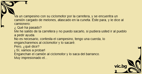 Va un campesino соn su ciclomotor por la carretera, y se encuentra un camión cargado de melones, atascado en la cuneta. Éste para, y le dice al camionero: