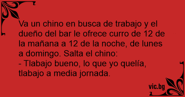 Va un chino en busca de trabajo y el dueño del bar le ofrece curro de 12 de la mañana a 12 de la noche, de lunes a domingo. Salta el chino: