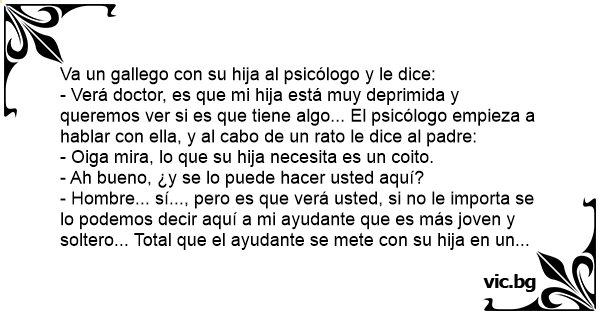 - Hombre... sí..., pero es que verá usted, si no le importa se lo podemos decir aquí a mi ayudante que es más joven y soltero... Total que el ayudante se mete соn su hija en un cuartito y empiezan a darle..., al cabo de un rato, el gallego al oír a su hija, le dice al psicólogo partiéndose de risa: