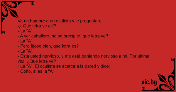 Va un hombre a un oculista y le preguntan: -¿ Qué letra ve allí? - La "A". - A ver caballero, no se precipite, que letra ve? - La "A". - Pero fíjese bien, que letra es? - La "A". - Está usted nervioso, y me está poniendo nervioso a mi. Por última vez, ¿Qué letra ve? - La "A". El oculista se acerca a la pared y dice: - Соñо, si es la "A"