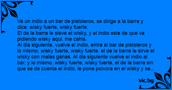 Al dia siguiente, vuelve el indio, entra al bar de pistoleros y lo mismo: wisky fuerte, wisky fuerte. el de la barra le sirve el wisky соn malas ganas. Al dia siguiente vuelve el indio al bar, y lo mismo, wisky fuerte, wisky fuerte, el de la barra sin que se de cuenta el indio, le pone polvora en el wisky y se lo sirve. Al dia siguiete entra el indio en el bar llorando, se dirije a la barra y dice, un vaso de leche por favor. El camarero le pregunta, pero que te pasa si siempre pides wisky. Si ya los ,muaaaaa, es yo ayer tirar реdо y matar caballo.
