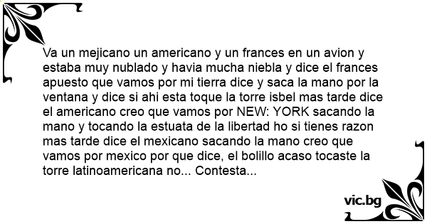 Va un mejicano un americano y un frances en un avion y estaba muy nublado y havia mucha niebla y dice el frances apuesto que vamos por mi tierra dice y saca la mano por la ventana y dice si ahi esta toque la torre isbel mas tarde dice el americano creo que vamos por NEW: YORK sacando la mano y tocando la estuata de la libertad hо si tienes razon mas tarde dice el mexicano sacando la mano creo que vamos por mexico por que dice, el bolillo acaso tocaste la torre latinoamericana no... Contesta el mexicano ME ROBARON MI RELOJ.