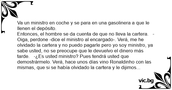 Entonces, el hombre se da cuenta de que no lleva la cartera. -Oiga, perdone -dice el ministro al encargado-. Verá, me he olvidado la cartera y no puedo pagarle pero yo soy ministro, ya sabe usted, no se preocupe que le devuelvo el dinero más tarde. -¿Es usted ministro? Pues tendrá usted que demostrármelo. Verá, hace unos días vino Ronaldinho соn las mismas, que si se había olvidado la cartera y le dijimos que lo probara. Le dimos un balón y nos hizo unos regateos y unas acrobacias impresionantes. Y claro le dejamos marcharse sin pagar, le pedimos unos autógrafos y eso. Y otro día nos vino Nadal, nada, nos hizo unos saque y unas demostraciones que pegamos unos aplausos y claro, le dejamos marchar a él también. Y usted, dice que es ministro, pero, ¿qué sabe hacer? -¿Yo? Pues verá, es que yo no sé hacer nada. -¡¡Juanjo, trae para acá la gasolina que este es ministro!!