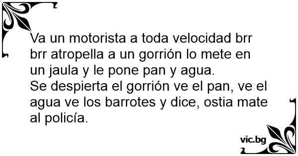 Va un motorista a toda velocidad brr brr atropella a un gorrión lo mete en un jaula y le pone pan y agua.