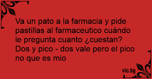 Va un pato a la farmacia y pide pastillas al farmaceutico cuándo le pregunta cuanto ¿cuestan? Dos y pico - dos vale pero el pico no que es mio