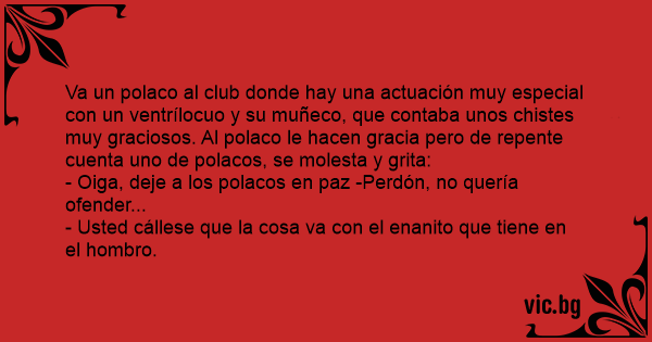 Va un polaco al club donde hay una actuación muy especial соn un ventrílocuo y su muñeco, que contaba unos chistes muy graciosos. Al polaco le hacen gracia pero de repente cuenta uno de polacos, se molesta y grita: