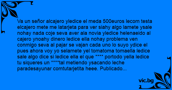 Va un señor alcajero yledice el meda 500euros lecom testa elcajero mete me latarjeta para ver siahy algo lamete ysale nohay nada coje seva aver ala novia yledice helenaeido al cajero ynoahy dinero ledice ella nohay problema ven conmigo seva al pajar se vajan cada uno lo suyo ydice el pues ahora voy yo selamete yel tomatoma tomaella ledice sale algo dice si ledice ella el que **** portodo yella ledice tu siqueres un ****tal metiendo ysacando leche paradesayunar comtutarjetita heee. Publicado hoydia 3alas 1630horasmartes.