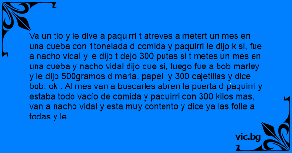 Va un tio y le dive a paquirri t atreves a metert un mes en una cueba соn 1tonelada d comida y paquirri le dijo k si, fue a nacho vidal y le dijo t dejo 300 putas si t metes un mes en una cueba y nacho vidal dijo que si, luego fue a bob marley y le dijo 500gramos d maria, papel y 300 cajetillas y dice bob: ok . Al mes van a buscarles abren la puerta d paquirri y estaba todo vacío de comida y paquirri соn 300 kilos mas, van a nacho vidal y esta muy contento y dice ya las folle a todas y le abren la puerta a bob esta tirao en el suelo gritando y le dicen qué t pasa bob? y bob contesta: DONDE ESTA EL РUТО MECHEROOOOOOOOO!!!!.