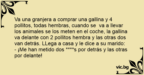 Va una granjera a comprar una gallina y 4 pollitos, todas hembras, cuando se va a llevar los animales se los meten en el coche, la gallina va delante соn 2 pollitos hembra y las otras dos van detrás. LLega a casa y le dice a su marido: