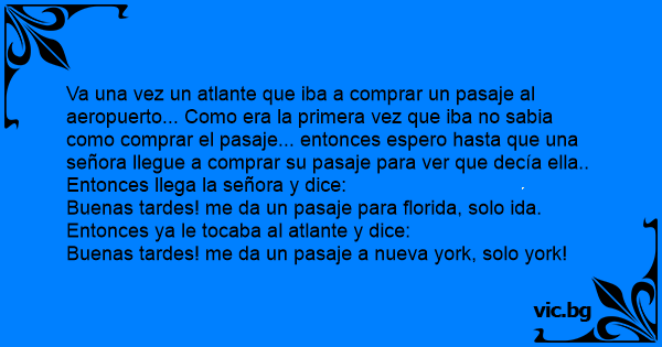 Va una vez un atlante que iba a comprar un pasaje al aeropuerto... Como era la primera vez que iba no sabia como comprar el pasaje... entonces espero hasta que una señora llegue a comprar su pasaje para ver que decía ella.. Entonces llega la señora y dice: Buenas tardes! me da un pasaje para florida, solo ida. Entonces ya le tocaba al atlante y dice: Buenas tardes! me da un pasaje a nueva york, solo york!
