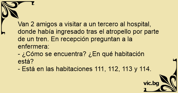 Van 2 amigos a visitar a un tercero al hospital, donde había ingresado tras el atropello por parte de un tren. En recepción preguntan a la enfermera: