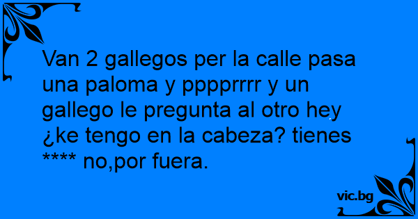 Van 2 gallegos per la calle pasa una paloma y pppprrrr y un gallego le pregunta al otro hey ¿ke tengo en la cabeza? tienes **** no,por fuera.