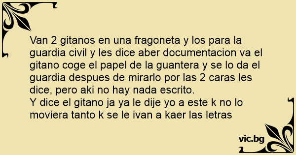 Van 2 gitanos en una fragoneta y los para la guardia civil y les dice aber documentacion va el gitano coge el papel de la guantera y se lo da el guardia despues de mirarlo por las 2 caras les dice, pero aki no hay nada escrito. Y dice el gitano ja ya le dije yo a este k no lo moviera tanto k se le ivan a kaer las letras