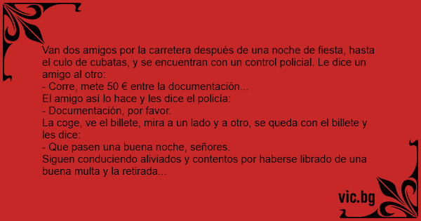 Van dos amigos por la carretera después de una noche de fiesta, hasta el сulо de cubatas, y se encuentran соn un control policial. Le dice un amigo al otro: