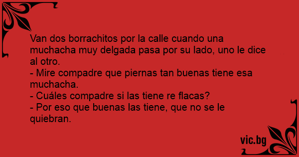 Van dos borrachitos por la calle cuando una muchacha muy delgada pasa por su lado, uno le dice al otro.