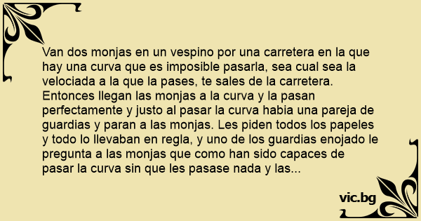 Van dos monjas en un vespino por una carretera en la que hay una curva que es imposible pasarla, sea cual sea la velociada a la que la pases, te sales de la carretera. Entonces llegan las monjas a la curva y la pasan perfectamente y justo al pasar la curva habia una pareja de guardias y paran a las monjas. Les piden todos los papeles y todo lo llevaban en regla, y uno de los guardias enojado le pregunta a las monjas que como han sido capaces de pasar la curva sin que les pasase nada y las monjas contestan: es que el señor va соn nosotras, y salta el guardia y les dice: Denunciadas por ir tres en el vespino.
