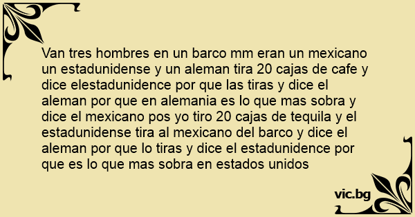Van tres hombres en un barco mm eran un mexicano un estadunidense y un aleman tira 20 cajas de cafe y dice elestadunidence por que las tiras y dice el aleman por que en alemania es lo que mas sobra y dice el mexicano pos yo tiro 20 cajas de tequila y el estadunidense tira al mexicano del barco y dice el aleman por que lo tiras y dice el estadunidence por que es lo que mas sobra en estados unidos