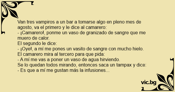 Един ден двама вампири влезли в бар. Първият казал: - Чаша топла кръв, ако обичате. - Веднага - отвърнал барманът. - А вие? - Чаша гореща вода - обадил се вторият вампир. След няколко минути барманът се върнал с чаша топла кръв и гореща вода и казал: - Вие сте вампири, нали? Щом пиете кръв......