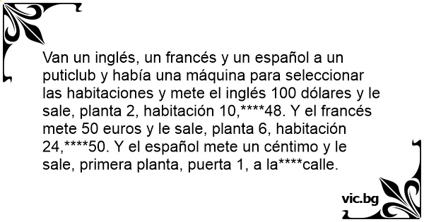 Van un inglés, un francés y un español a un puticlub y había una máquina para seleccionar las habitaciones y mete el inglés 100 dólares y le sale, planta 2, habitación 10,****48. Y el francés mete 50 euros y le sale, planta 6, habitación 24,****50. Y el español mete un céntimo y le sale, primera planta, puerta 1, a la****calle.