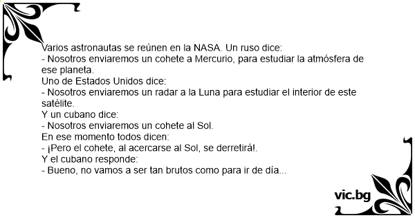 En Ryss, en Amerikan och en Arab satt och pratade.. Ryssen: - Vi var först i rymden Amerikanen: - Ja, men vi var först på månen! Araben: - Vi ska bli dom första på solen! Ryssen och Amerikanen: - Ni kommer brinna upp innan ni är framme! Araben: - Bror, vi ska dit på kvällen..