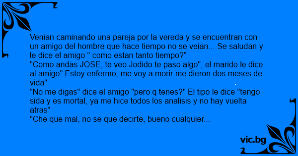 "Che que mal, no se que decirte, bueno cualquier cosa vos avisame" le dice a la mujer del amigo, y luego de esto se va muy compungido. La mujer le dice al marido "Hay gordo porque le mentiste, aunque sea verdad que vas a morirte, porque le dijiste que ibas a morirte de SIDA?" y este le contesta " yo morirme me muero igual, pero a vos no te coje ni el loro la ****"