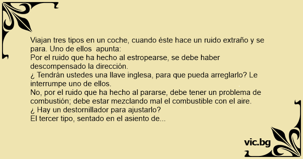 Viajan tres tipos en un coche, cuando éste hace un ruido extraño y se para. Uno de ellos apunta: