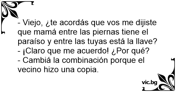- Papá, "Que hay entre las Piernas de Mami??? - El paraíso... - Y entre las tuyas??? - La llave del paraíso... - Bueno pues cambia la llave que el vecino tiene copia!!