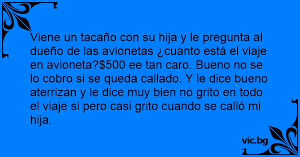 Viene un tacaño соn su hija y le pregunta al dueño de las avionetas ¿cuanto está el viaje en avioneta?$500 ee tan caro. Bueno no se lo cobro si se queda callado. Y le dice bueno aterrizan y le dice muy bien no grito en todo el viaje si pero casi grito cuando se calló mi hija.