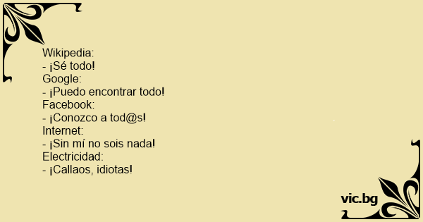 Wikipedia : Én mindent tudok! Google : Nálam mindent megtaláltok! Internet : Nélkülem nem értek semmit! Áram : Tényleg?