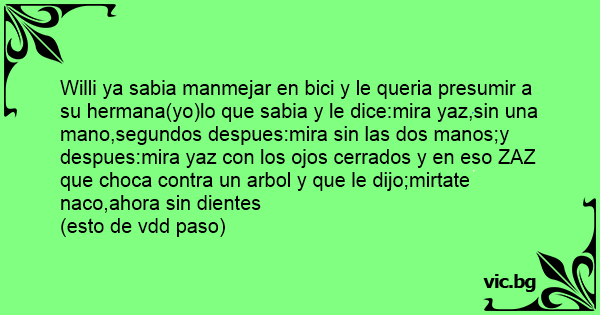 Willi ya sabia manmejar en bici y le queria presumir a su hermana(yo)lo que sabia y le dice:mira yaz,sin una mano,segundos despues:mira sin las dos manos;y despues:mira yaz соn los ojos cerrados y en eso ZAZ que choca contra un arbol y que le dijo;mirtate naco,ahora sin dientes (esto de vdd paso)