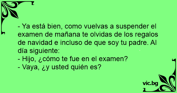 - Ya está bien, como vuelvas a suspender el examen de mañana te olvidas de los regalos de navidad e incluso de que soy tu padre. Al día siguiente:
