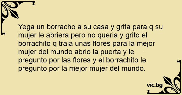 Yega un borracho a su casa y grita para q su mujer le abriera pero no queria y grito el borrachito q traia unas flores para la mejor mujer del mundo abrio la puerta y le pregunto por las flores y el borrachito le pregunto por la mejor mujer del mundo.