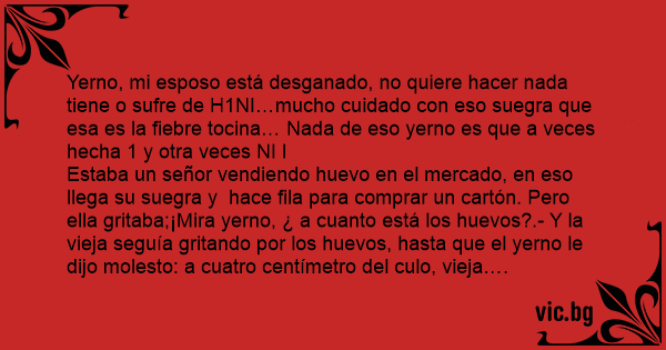 Estaba un señor vendiendo huеvо en el mercado, en eso llega su suegra y hace fila para comprar un cartón. Pero ella gritaba;¡Mira yerno, ¿ a cuanto está los huеvоs?.- Y la vieja seguía gritando por los huеvоs, hasta que el yerno le dijo molesto: a cuatro centímetro del сulо, vieja….
