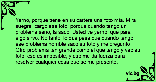 Yerno, porque tiene en su cartera una foto mía. Mira suegra, cargo esa foto, porque cuando tengo un problema serio, la saco. Usted ve yerno, que para algo sirvo. No tanto, lo que pasa que cuando tengo ese problema horrible saco su foto y me pregunto. Otro problema tan grande como el que tengo y veo su foto, eso es imposible, y eso me da fuerza para resolver cualquier cosa que se me presente.